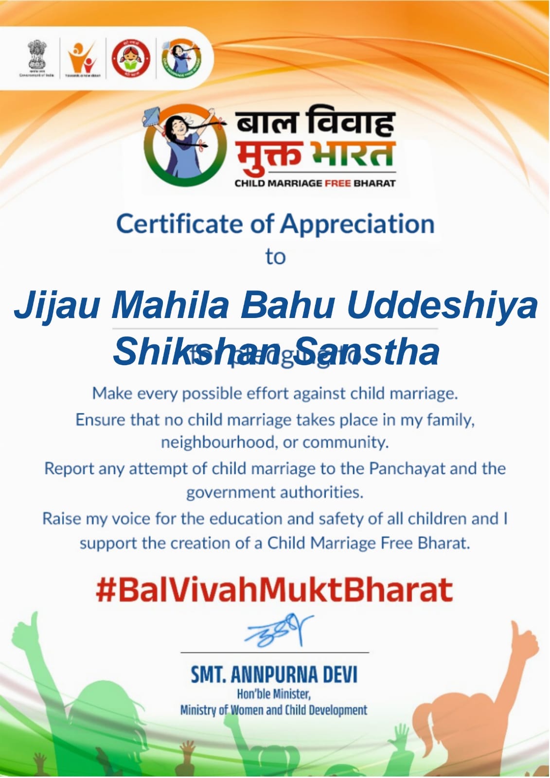 Child Marriage Free Bharat Certificate