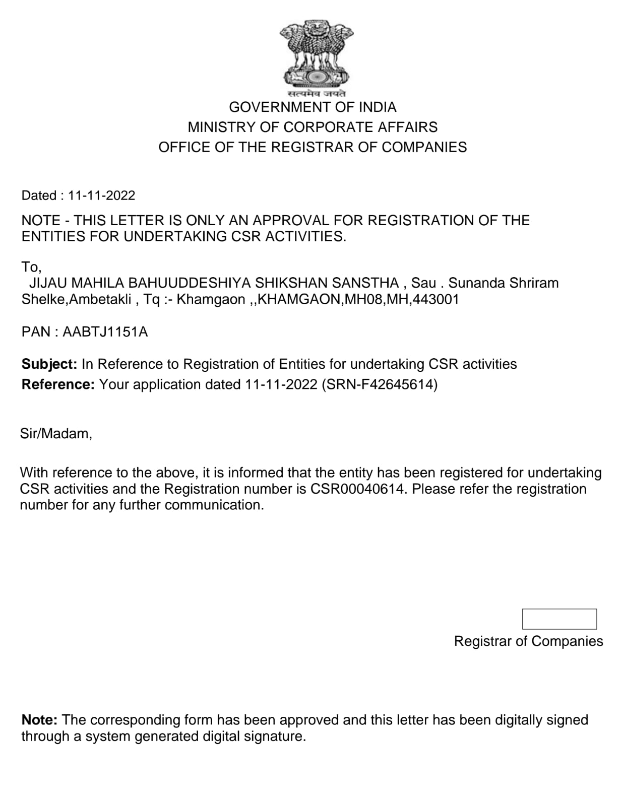 CSR Certificate Of Our Society